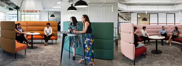豐富多元的工作空間包括專注工作、團隊協作和休閑等功能空間,每個空間都配置以不同程度的視覺和聽覺等隱私的設計考量。在以中性色為主調的空間中,加入優雅靚麗的復合色(又叫“三次色”)來營造活力的視覺效果。