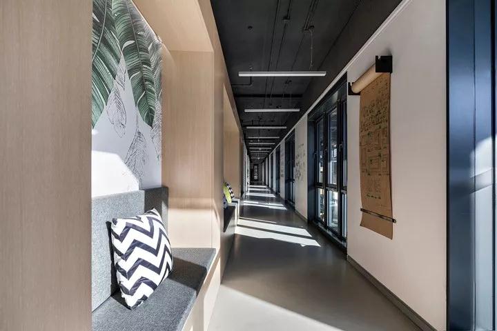 至于盒子以外的空間,設(shè)計(jì)師想凝聚更多的人文藝術(shù)氣息,選擇較多地去鋪陳展示各種抽象的藝術(shù)線條和畫(huà)作,同時(shí)為了不失去生活氣息,各個(gè)角落選擇顏色比較跳躍的家居什物,讓它作為一個(gè)流動(dòng)的戶(hù)外廣場(chǎng),讓人可以自在穿行其中,偶爾停駐觀察,經(jīng)得住人聲鼎沸的喧擾,亦能提供心靈靜憩的安寧。在這里,大家認(rèn)真辦公、生活、盡情交流、分享,它就是一個(gè)安放綠意,有極高包容度的公共空間。