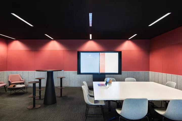 開放工作區沿外窗布局,寫字樓裝修設計團體以最大限度獲取自然光照。曲線形設計融入到原本的線性空間,給人以柔軟和溫暖的感覺。以大自然為靈感的鮮明色調包括深紅、珊瑚色、森林綠、水鴨色和墨藍色,每種顏色都構筑出各自不同的功能區域,共同烘托出一個時尚優雅的空間氛圍。