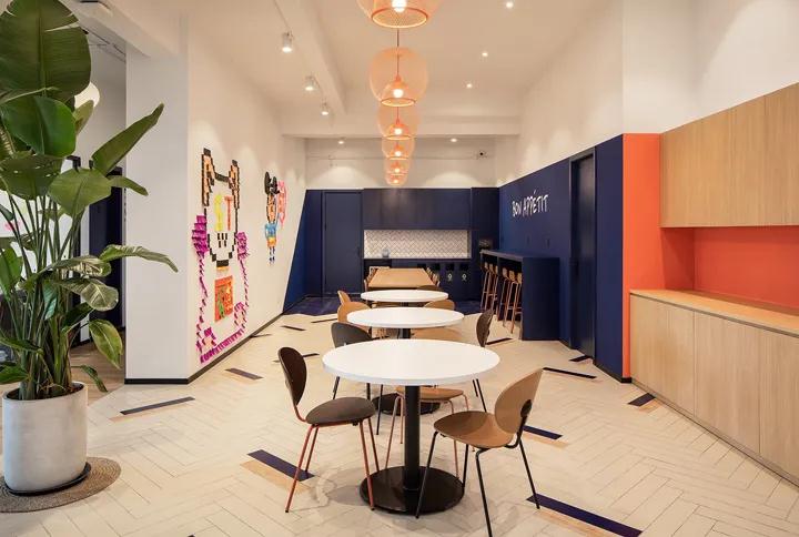 該空間用于服務(wù)整個辦公樓的商業(yè)餐廳。全部拆除后,露出了幾個混凝土結(jié)構(gòu)柱。設(shè)計團隊將其組合到會議室的墻壁中,粗糙的原始結(jié)構(gòu)與精致的白色新墻壁形成鮮明的對比,為空間提供了更豐富的文化質(zhì)感和歷史感。但是,最令人驚訝和獨特的建筑結(jié)構(gòu)是中央的雙層高架大空間,頂部的窗戶不僅帶來了空間所需的自然光,而且還帶來了令人震驚的太空視野。