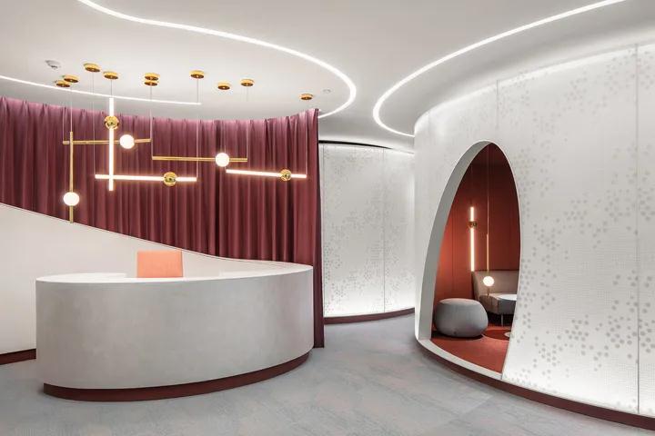 進入大廳,兩個顯著的圓柱結構被放置在其中,分別用作協商區域和閱讀區域。白色丙烯酸外殼,棗紅色內飾,科技的外觀蘊含時尚先鋒。設計師希望人們能夠在進入辦公室區域之前在這兩個密閉空間中平靜下來。