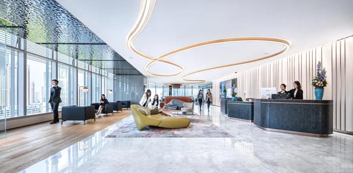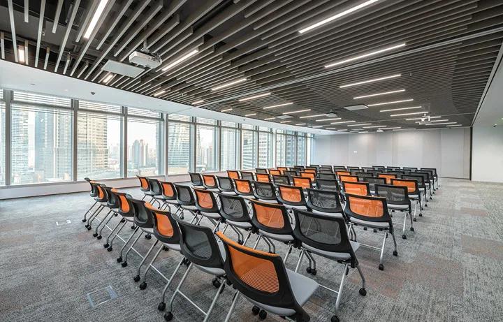 此外,為新辦公樓規(guī)劃和設(shè)計了一個多功能空間,可用于聚會和聯(lián)賽建設(shè),公益基金會展覽,集思廣益,舞蹈室,團(tuán)體運(yùn)動室,瑜伽室等,從而員工可以輕松享受高質(zhì)量的體驗(yàn),緩解疲勞,保持工作健康并改善情感聯(lián)系和幸福指數(shù)。鑒于公司不斷增長的業(yè)務(wù)需求和社交活動,該空間創(chuàng)造性地引入了一個酒吧區(qū),該酒吧區(qū)擁有舉辦公司外事和內(nèi)部活動的絕佳景觀。標(biāo)志墻上方的藝術(shù)裝置燈具就像“龍游”,因此光滑的天花燈帶將延續(xù)這里前部的靈巧氛圍;酒吧的上方圓圈設(shè)計為鮮橙色,形成了一個充滿活力的社交中心,增進(jìn)了中國與客戶之間的聯(lián)系,并提供了美妙的客戶體驗(yàn)。空間的平面布局充分利用了無與倫比的城市景觀,使員工和游客可以享受心情并緩解動態(tài)景觀帶來的壓力。轉(zhuǎn)角會議室的兩側(cè)都有窗戶,可將深圳地標(biāo)性建筑景觀盡收眼底。會議室配有智能會議系統(tǒng),可以方便,高效地支持不同的會議場景和要求。會議室的膠卷比傳統(tǒng)膠卷低15厘米,以確保會議室的私密性,并為游客提供直接面對陸家嘴的景觀走廊。培訓(xùn)中心擁有充足的自然采光,可輕松布置各種布局,并配有可移動的隔板,以提高空間利用率,并為所有員工會議,教學(xué)和培訓(xùn),主題演講,模擬法庭等創(chuàng)建靈活靈活的多個場景。為了在培訓(xùn)過程中滿足用戶的臨時通話需求,在附近規(guī)劃了兩個具有隔音效果的電話亭,從使用細(xì)節(jié)上改善空間的功能性,營造以人為本的全方位環(huán)境。