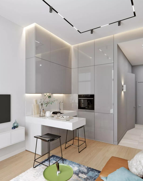 我們在小戶型裝修設(shè)計中因空間受限,時常難以妥善規(guī)劃,深圳裝飾公司雄宇裝飾便將公私領(lǐng)域一分為二,從玄關(guān)進(jìn)入即可看見一道墻隔開客餐廳與臥室。公空間雖然狹小,但運(yùn)用斑駁藍(lán)白地毯便能簡單作出區(qū)隔,此時搭配對比色深橘沙發(fā),就可輕易塑造視覺主焦點(diǎn),穩(wěn)定室內(nèi)不顯紊亂;廚房柜體則透過延續(xù)玄關(guān)淺灰色調(diào),借此連貫空間營造寬敞感,料理區(qū)則保留簡易烹調(diào)器具,深圳家庭裝修并且以L型臺面連結(jié)吧臺桌面拓展出精簡用餐區(qū)。